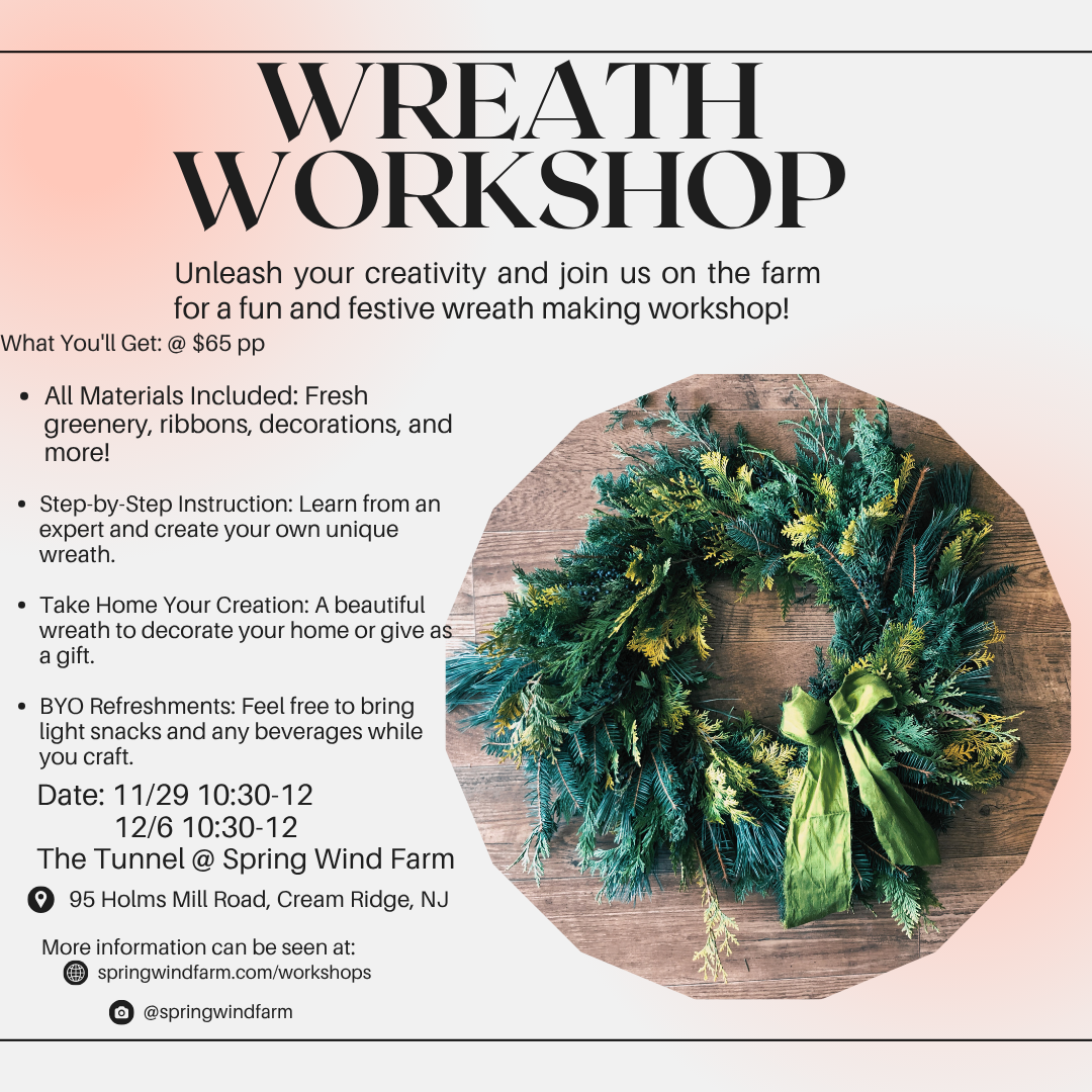 Come get cozy in the tunnel and make a wreath! We have a fun selection of greens and other natural elements to adorn your wreaths. $65 pp- email hello@springwindfarm.com with any questions.